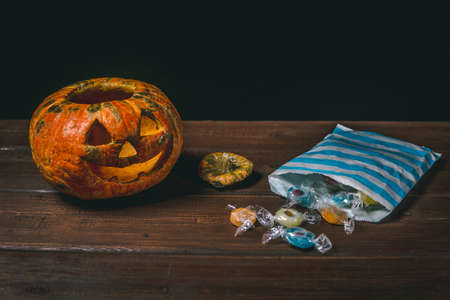 Happy Halloween pumpkin and candies. Trick or treat on a wooden table on a background of old wooden boards. Halloween background. Space for text.