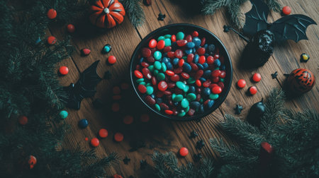 A vibrant bowl filled with an assortment of colorful candy surrounded by Halloween decorations, setting a playful and festive mood for celebrations.