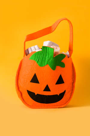 Hand holding Halloween pumpkin bag with candies inside isolated on yellow background