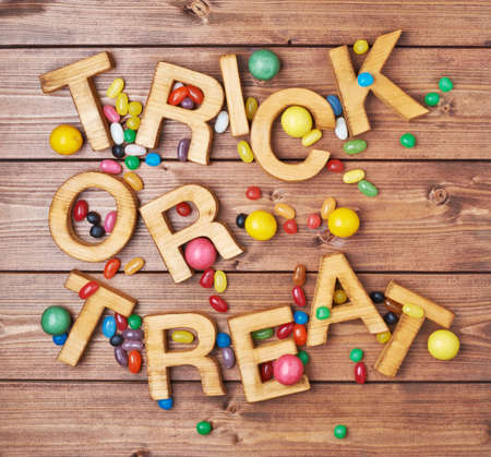 Trick or treat written with wooden letters and multiple candy sweets lying around over the covered with brown boards surface composition