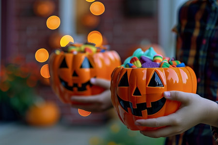 A young child holds two pumpkin-shaped buckets filled with colorful candies against a backdrop of glowing lights, capturing the joy and excitement of trick-or-treating on Halloween.