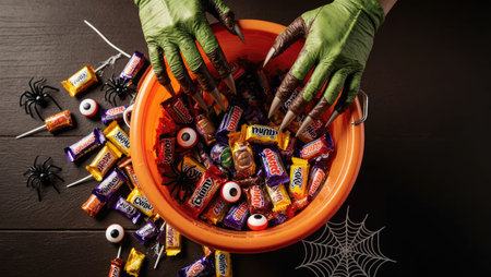 Costumed monster hands eagerly dig through a pumpkin bucket full of Halloween candy, chocolate spiders, and eyeball lollipops. A scene of joyful abundance.