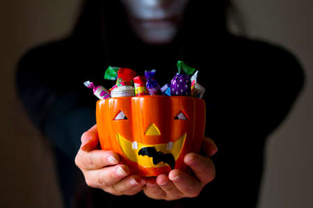 Hands holding bucket ready for halloween. Child having fun at Halloween trick or treat.Kids trick or treating. Autumn October