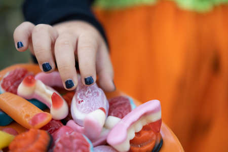 Halloween background. childrens hands reach for the scary candy on the plate