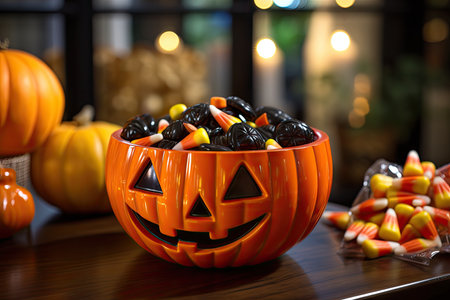Plastic jack o lantern with marmalade on white table on halloween decorated background