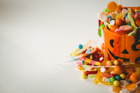 High angle view of orange bucket with various sweet food during Halloween on white background