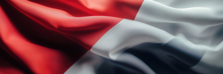 A vibrant national flag flutters softly in the breeze, showing its smooth fabric and elegant design under soft natural light, creating a serene atmosphere.