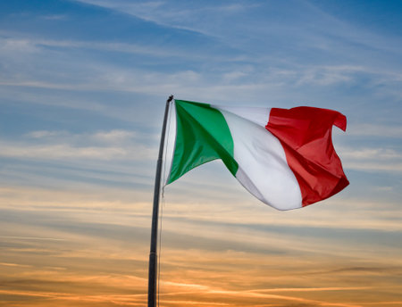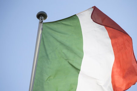 Flag of Italy blowing in the wind in Gallipoli, Italy. Flag with a blue sky in the background on a bright summer day.