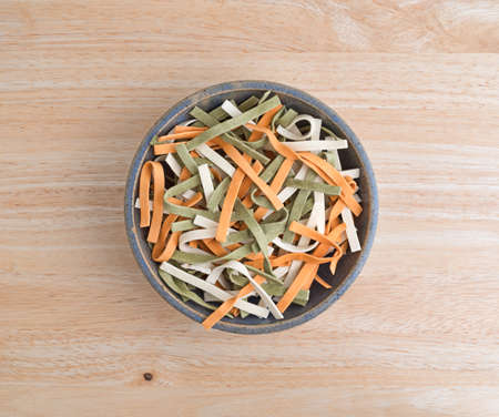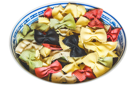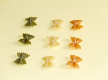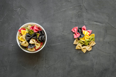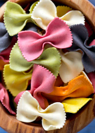 Italian farfalle pasta in bowl. Raw multicolored farfalle pasta, overhead view