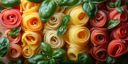 Bunch of Italian green multicolored pasta with tomato and basil flavor, top view