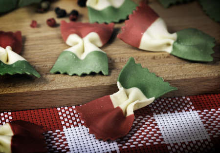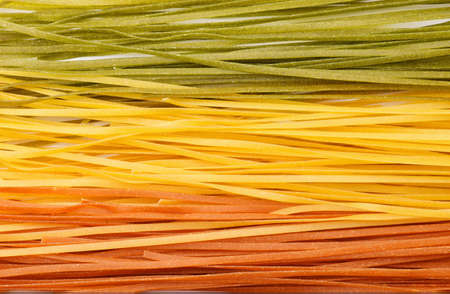 Italian pasta, three color from durum wheat with vegetables on the kitchen textiles, background, selective focus. for use as background image or as texture