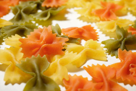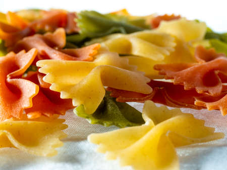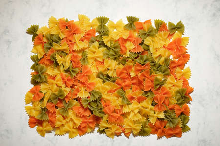Colorful Italian pasta background. Various colors of bow tie farfalle pasta. Top view. Selective focus.