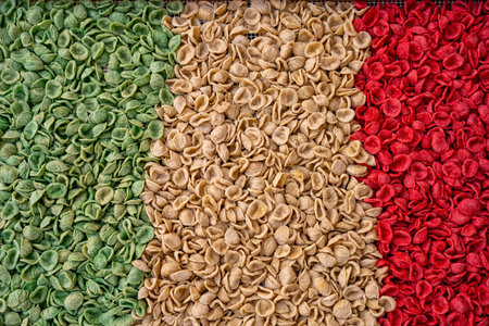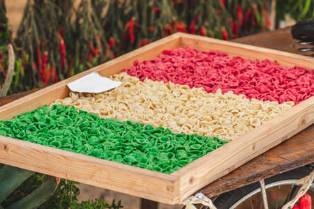 Traditional Apulian orecchiette in the colors of the Italian flag seen in the streets of Bari