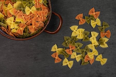Lot of whole red, yellow and green uncooked farfalle in old pot flatlay on grey stone
