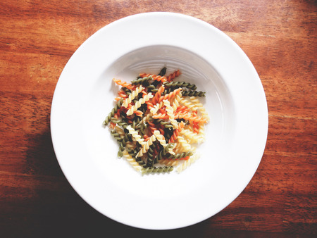 It's time to cook, The picture of multicolored of dried fusilli consist of yellow, orange and green on white plate above wooden table. soft tone color