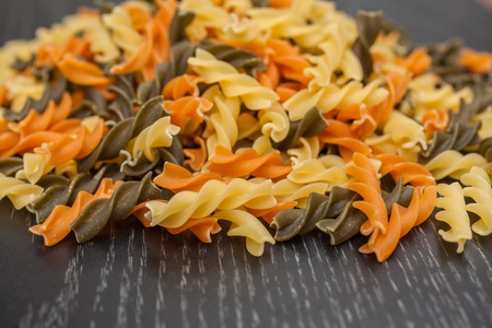 Three colors fusilli pasta. Colorful italian raw pasta. Top view.