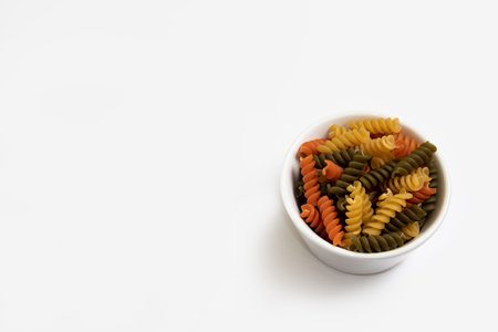 It's time to cook, The picture of multicolored of dried fusilli consist of yellow, orange and green on white background. soft tone color