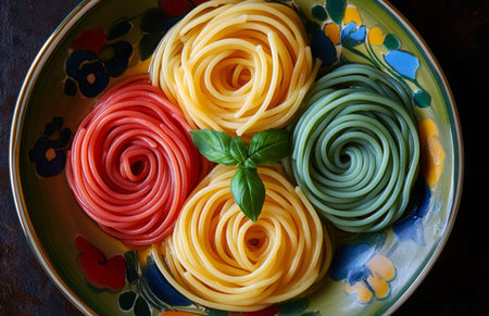 A vibrant plate of spaghetti with a colorful spiral in four bold colors