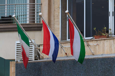 Italy Netherlands Hungary flags hang on a wall in Malta
