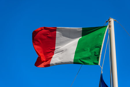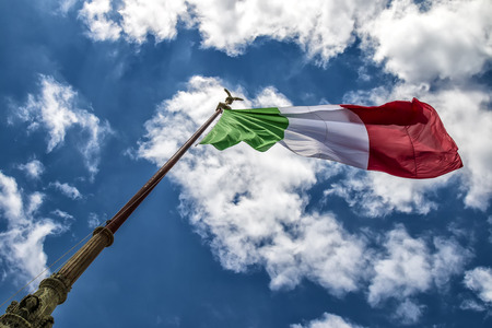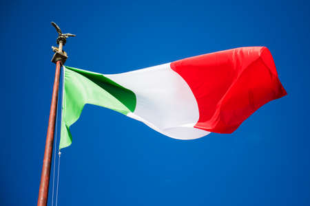 Italian flag fluttering in the wind, with blue sky. Green, White, Red and Azure are Italian national colors.