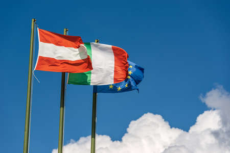 Austrian, Italian and European Union flags with flagpole, blowing togetherness in the wind on a clear blue sky with clouds and copy space.