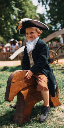 Young boy in colonial costume and tricorn hat smiles while sitting on a wooden hobby horse at an outdoor historical park during a heritage reenactment event