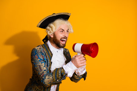 Historic Nobleman in Elegant Costume Holding a Megaphone Against a Bright Yellow Backdrop
