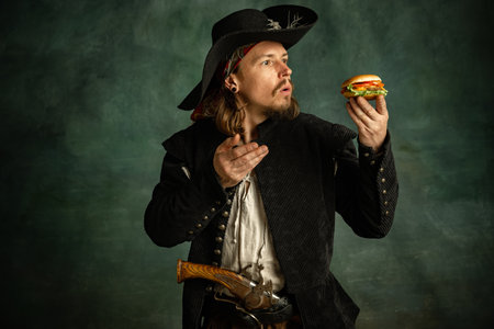 Portrait of one brutal man, medeival pirate with expressive face looking at burger isolated over dark background.