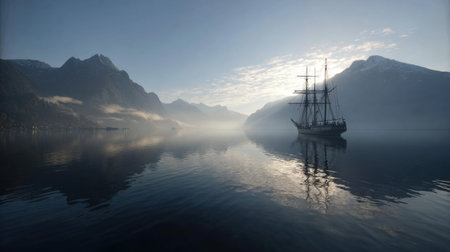 A captivating scene featuring a majestic sailing ship anchored in calm waters, embraced by misty mountains at dawn, creating a serene atmosphere.