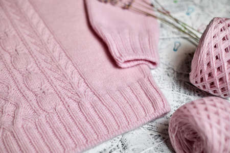 Pink knitted women's sweater with patterns and balls of thread