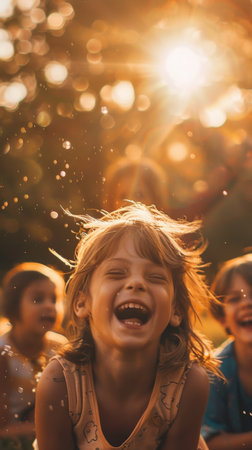 A group of children joyfully playing and laughing together in a sunny meadow.