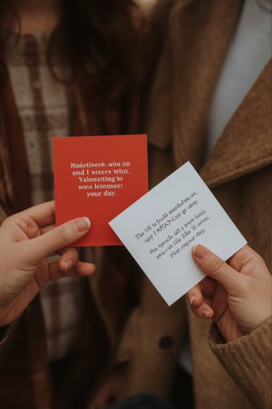 Two individuals hold Valentine's Day cards in an outdoor setting, dressed in coats. The moment captures affection and celebration. Ideal for romantic, seasonal, and greeting card themes.