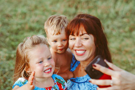 mom takes photos of herself with children on her phone