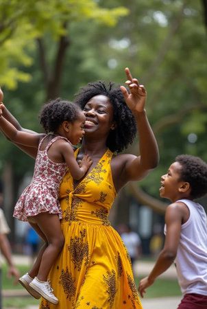African American mother and children dancing in Central Park.