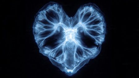 Heart-shaped blue glow with intricate lines and patterns on a dark background