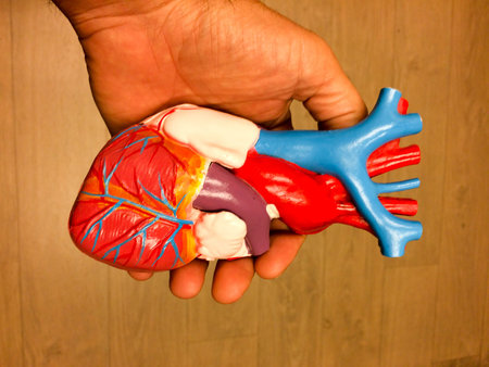 Heart model held in hand, showing detailed anatomy and blood vessels for educational purposes