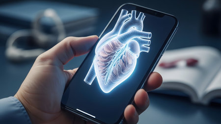 Person showing person holding mobile phone with wireframe 3d human heart hologram displayed....