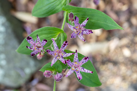Close-up of beautiful toad lily flowers blooming in autumn garden.