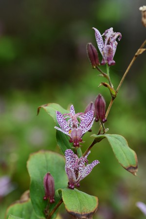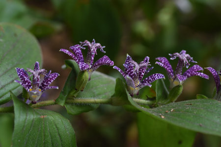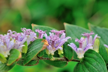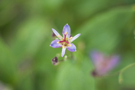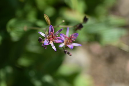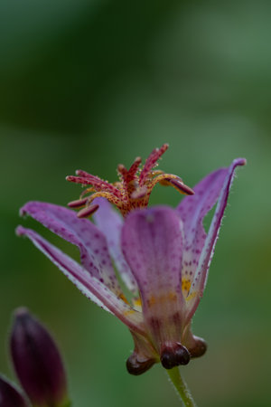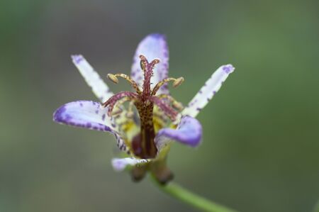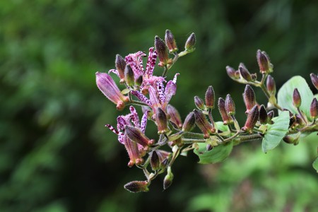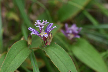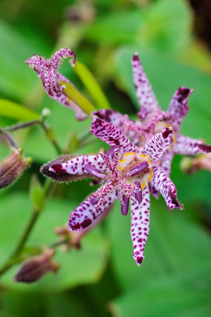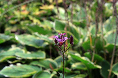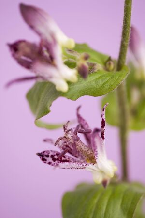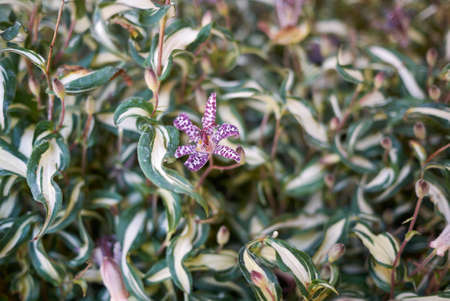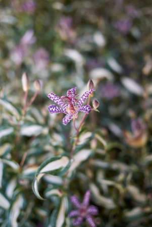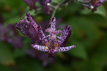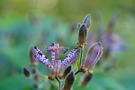 Small purple spotted flower Tricyrtis hirta growing in summer garden