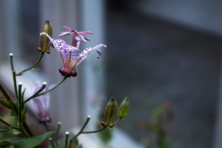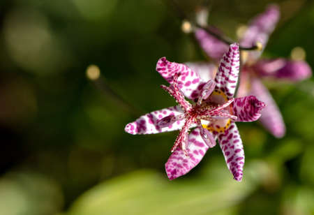 Cute tiny Tricyrtis toad lily flower growing in a flowerbed on a blurred bokeh background. A photo with free blank copy space for text. For cards, posters or website decoration