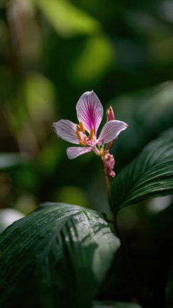 A detailed photograph of a single Maranta flower, swaying gently in the wind, captured in natural daylight. Fresh and airy atmosphere, soft motion blur on leaves, crisp details on textures, background softly blurred into natural greenery, cinematic natural light, realistic photography.