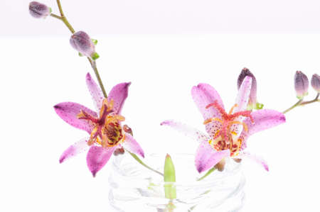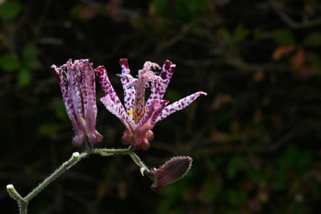 Japanese toad lily Tricyrtis hirta side view space for text, horizontal aspect