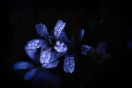 Purple flower petals with water drops sliding down the petals after a summer rain