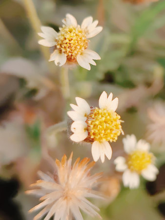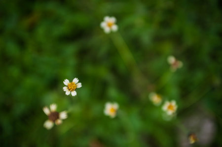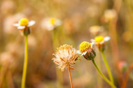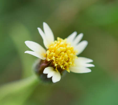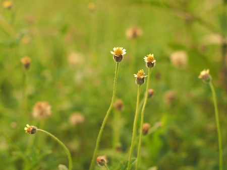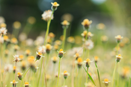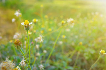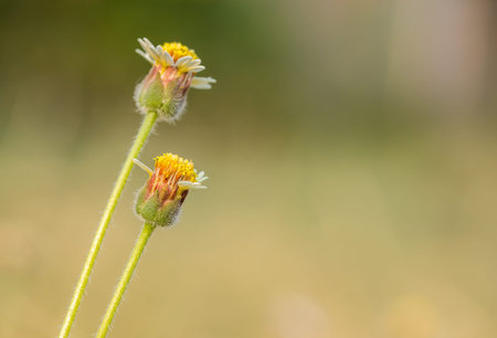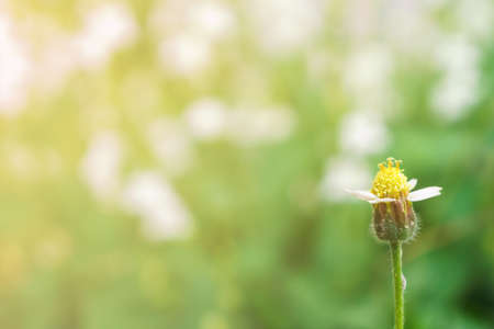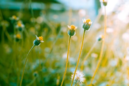 Coat buttons, Mexican daisy, Tridax daisy, Wild Daisy flower blurry under morning sunlight , Close Up Macro