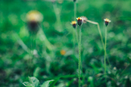 Top view of small yellow flower of grass and blur green nature background