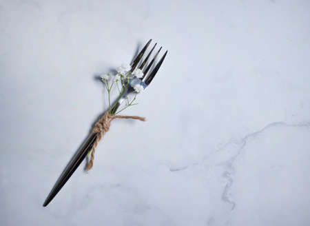 fork, gypsophila flower on concrete background