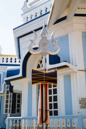 The Trident of Shiva. A silver symbol of the power of the god Shiva. An object of Indian culture.