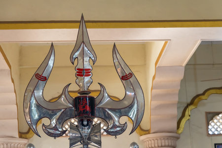 ornate holy metallic shiva trishul displayed inside hindu temple interior