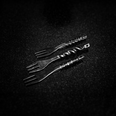 This is an artistic portrayal of black forks elegantly arranged on a dark surface