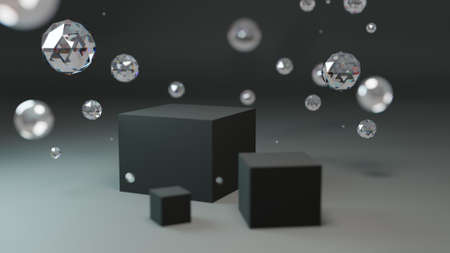 3d black podium for product presentation. Minimal modern product display with crystal. Rendering scene with black cubes on dark background.